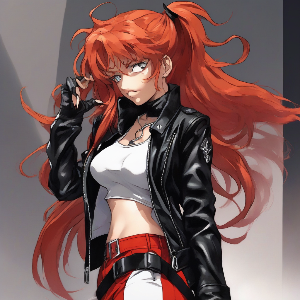 As Asuka struts down the catwalk, her long, curly red hair bouncing with each step, she exudes an unapologetic confidence that is simply mesmerizing. Her designer outfit, a perfect blend of toughness and elegance, showcases her fearless and uncompromising personality. The sleek black leather jacket with metallic accents, paired with a flowing, high-low hemmed skirt in a bold, fiery red color, is a true showstopper. The skirt's asymmetrical design adds a touch of dynamism to the overall look, mirroring Asuka's unpredictable and fierce nature.