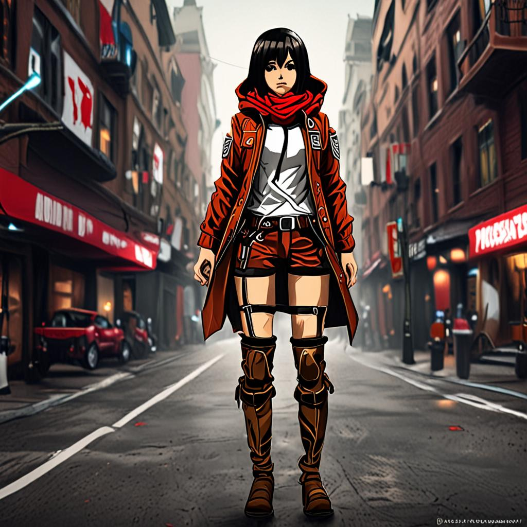 Keywords: Mikasa Ackerman Attack on Titan streetwear fashion anime Tokyo 3D maneuver gear graphic t-shirt hoodie sneakers denim jacket fashion forward piercig gaze confident stride femininity silver choker sparkling pendant unstoppable force Titans