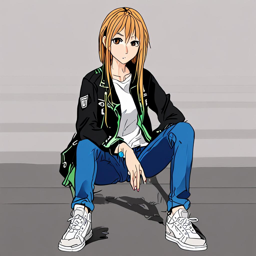 Asuna Yuuki from Sword Art Online trades her traditional armor for a trendy streetwear outfit, showcasing her edgy side with a sleek graphic t-shirt, distressed denim jeans, and crisp white sneakers, exuding confidence and poise as a true fashion icon.