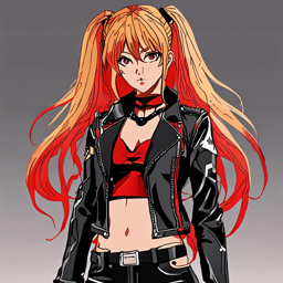 Asuka Langley Soryu, the confident pilot of Evangelion Unit-02, reimagined in a bold, edgy fashion outfit that showcases her fearless personality, featuring a sleek black leather jacket, fishnet stockings, and heavy-duty combat boots.