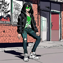 Mikasa Ackerman from Attack on Titan rocks a trendy streetwear outfit, trading her Survey Corps uniform for a sleek black hoodie, distressed denim jeans, and neon green sneakers, showcasing a unique blend of tough and chic style.