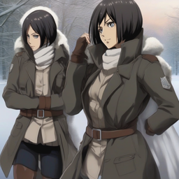 Mikasa Ackerman from Attack on Titan trades her uniform for a stylish winter outfit, featuring a black turtleneck sweater, snow-white skirt, and crimson scarf, showcasing her confident and capable personality in a rare moment of peace and camaraderie at a winter festival.