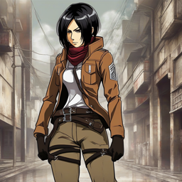 Mikasa Ackerman from Attack on Titan trades her Survey Corps uniform for a trendy streetwear outfit, showcasing her unique and edgy style as she walks down a bustling city street, blending her tough personality with bold fashion choices.