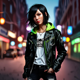 Mikasa Ackerman, the fearless heroine from Attack on Titan, trades her Survey Corps uniform for a trendy streetwear outfit, showcasing her adaptability and personality through fashion, with a bold graphic t-shirt, distressed denim jeans, and sleek leather jacket, exuding confidence and quiet strength in a vibrant urban setting.