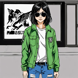 Mikasa Ackerman trades in her 3D maneuver gear for a stylish streetwear outfit, showcasing her fierce personality in a chic and edgy ensemble featuring a graphic t-shirt, distressed denim jeans, and oversized denim jacket with Survey Corps embroidery.