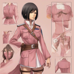 Mikasa from the Scout Regiment is reimagined in a unique and stylish outfit, showcasing her softer side while still hinting at her strong and capable personality, featuring a pastel pink dress, statement boots, and delicate accessories.