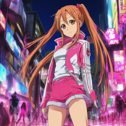 Asuna Yuuki from Sword Art Online rocks a bold 80s-inspired outfit, featuring a vibrant pink denim jacket, black leather mini skirt, and statement-making accessories, showcasing her confidence and sass in a unique and eye-catching look