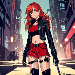 Asuka Langley Soryu, the confident pilot of Evangelion Unit-02, rocks a bold and edgy fashion outfit, blending punk rock, cyberpunk, and futuristic elements, showcasing her fearless personality and style inspiration from Japanese street fashion and sci-fi flair.
