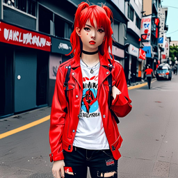 Asuka Langley Soryu, the iconic pilot from Neon Genesis Evangelion, showcases her bold and edgy streetwear style in Harajuku, Tokyo, featuring a sleek black graphic t-shirt, distressed denim jeans, and a black leather jacket, perfectly capturing her fierce and confident personality.