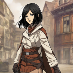 Imagine Mikasa Ackerman, the stoic and deadly protagonist from Attack on Titan, trading in her Survey Corps uniform for a trendy streetwear outfit, featuring a black graphic t-shirt, distressed denim jeans, and bold accessories that reflect her tough and edgy personality.