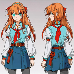 Asuka Langley Soryu from Neon Genesis Evangelion is reimagined in a bold, bohemian chic fashion ensemble, showcasing her fearless personality and confidence, trading her iconic plug suit for a flowing turquoise peasant blouse, distressed denim skirt, and rugged leather boots, with a subtle nod to her pilot roots through a delicate silver pendant in the shape of Evangelion Unit-02.