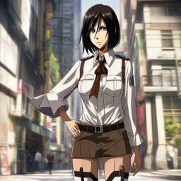 Mikasa Ackerman, the strong and stoic heroine from Attack on Titan, showcases her fierce and fashionable side in a sleek modern ensemble as she struts down the streets of Tokyo. Her outfit features a black and white houndstooth blouse, high-waisted dark grey pencil skirt, black leather ankle boots, and bold red lip color, perfectly balancing her tough and feminine persona. With a simple silver necklace and trendy oversized sunglasses, Mikasa exudes confidence and style, proving that a strong and silent type can make a fashion statement.