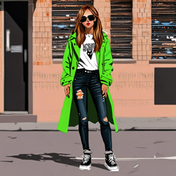 Asuna Yuuki from Sword Art Online rocks a bold streetwear outfit in Tokyo, blending cutting-edge style with her unique personality, featuring a black and neon green windbreaker, distressed denim jeans, and chunky sneakers with neon green laces, completed with accessories like a sword pendant and LED cuffs, showcasing her adventurous and fearless personality.