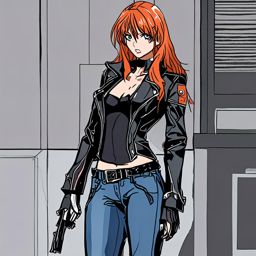 Discover Asuka Langley Soryu's bold and chic fashion outfit, featuring a sleek black leather jacket, distressed denim jeans, and industrial chic ankle boots, perfectly capturing her confident and edgy personality.