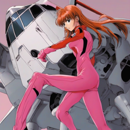Asuka Langley Soryu, the charismatic pilot of Evangelion Unit-02, showcases her unique style in a bold cyberpunk and Gothic Lolita fashion outfit, complete with a sleek jumpsuit, flowing skirt, and futuristic boots, embodying her confident and fearless personality.
