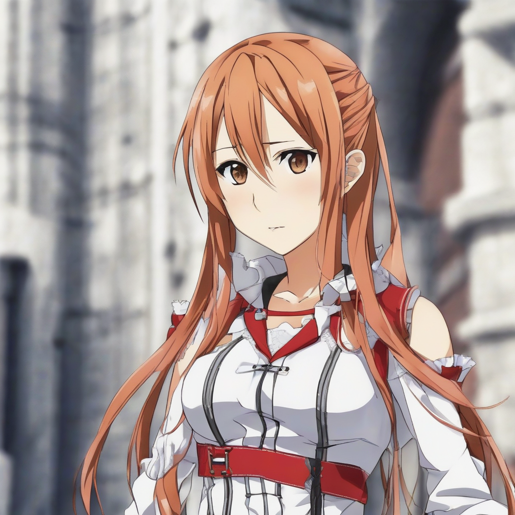 El cabello largo y dorado de Asuna está peinado en ondas sueltas y sin esfuerzo que caen por su espalda, enmarcando sus brillantes ojos marrones que brillan con confianza. Sus pies están calzados con un par de botas de tobillo negras y elegantes con hebilla de plata, que agrega un toque de audacia al conjunto general. Un delicado collar de plata con un pequeño pendiente de espada - un homenaje a sus habilidades icónicas de esgrima - agrega un toque de fantasía al look, recordándonos de la personalidad valiente y decidida de Asuna.
