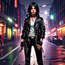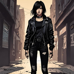 Mikasa Ackerman de Attack on Titan intercambia su uniforme de los Cuerpos de Exploración por un atuendo de moda callejera atrevido, mostrando su lado osado y vanguardista con una chaqueta de windbreaker negra y verde neon, jeans de mezclilla desgastados y accesorios llamativos, reflejando su actitud intrépida y su personalidad dura.