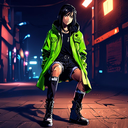 Mikasa Ackerman de L'Attaque des Titans arbore un look streetwear audacieux, échangeant son uniforme du Corps d'exploration pour un blouson à imprimerie de graffiti, des jeans de denim délavés et des bottes de combat élégantes, mettant en valeur sa capacité à allier la dureté et la féminité avec un style urbain.