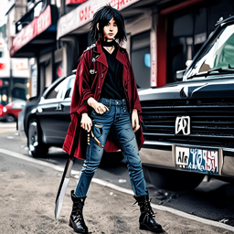 Mikasa Ackerman de L'Attaque des Titans échange son équipement de manœuvre 3D pour un outfit de streetwear tendance, présentant un tee-shirt de groupe graphique, un jean délavé et des bottines élégantes, mettant en valeur son style unique et osé alors qu'elle navigue dans le Tokyo moderne avec confiance et une touche de féminité.
