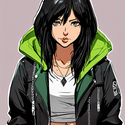 Asuka Langley Soryu, le pilote emblématique de Neon Genesis Evangelion, porte un look streetwear audacieux qui incarne son style audacieux et technique, présentant un ensemble noir et vert néon élégant, avec des accents métalliques, un jeans délavé et des accents vert néon, mettant en valeur sa confiance et sa passion pour la technologie et l'innovation.