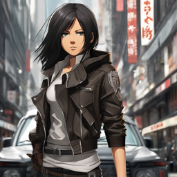 Mikasa Ackerman échange son équipement de manœuvre 3D pour un tenue de streetwear élégante, présentant un sens de la mode audacieux et édgy avec un blouson rose pastel, des jeans délavés et des accessoires tendances, révélant un côté décontracté et à la mode de sa personnalité.