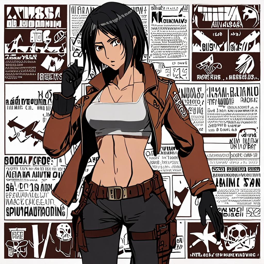 まとめ: ミカサ・アッカーマンはSurvey Corpsのユニフォームを現代のストリートウェアに替えて、黒のクロップトップ、لع気でつや Crackle denimのジーンズ、以及び大きなジーンズジャケットを身にまとい、大胆なアクセサリーと堂々とした気迫で、 emocional対立と女性らしさを 구현しています。